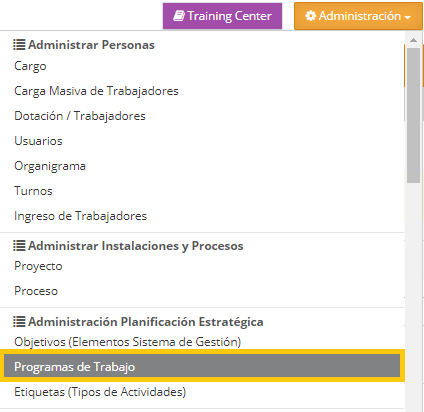 - Acceso a Administración: Con privilegios de administrador, acceda a la opción 'Administración' en el menú y seleccione 'Programa de trabajo'.