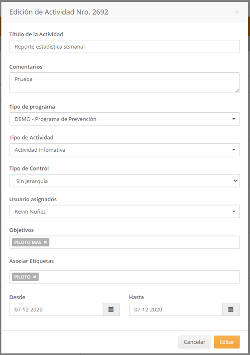- Se abrirá una ventana modal mostrando el ID de la actividad y su configuración actual. Realice los cambios necesarios en los campos proporcionados.
