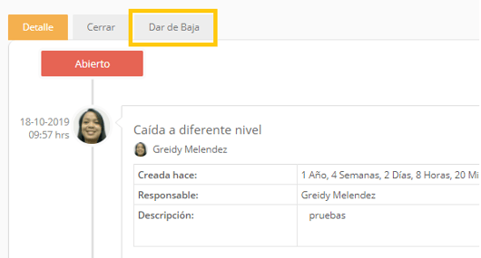 - Dentro del hallazgo, haz clic en el botón "Dar de baja". Esta opción solo estará disponible si cuentas con los permisos necesarios.